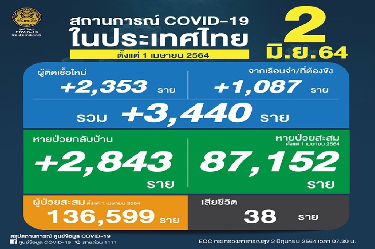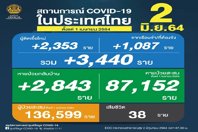 -พบผู้ติดเชื้อเพิ่มขึ้น3,440ราย จำแนกเป็น ผู้ติดเชื้อใหม่ 2,353 ราย , ติดเชื้อภายในเรือนจำ/ที่ต้องขัง 1,087 ราย