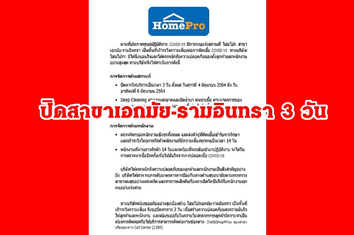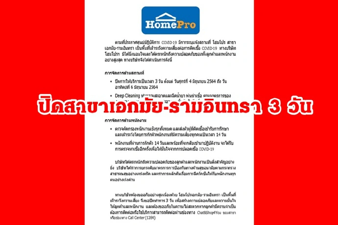 โฮมโปร แจ้งปิดสาขาเอกมัย-รามอินทรา 3 วัน 4-6 มิ.ย. ฉีดน้ำยาฆ่าเชื้อโควิด-ตรวจคัดกรองเชิงรุก