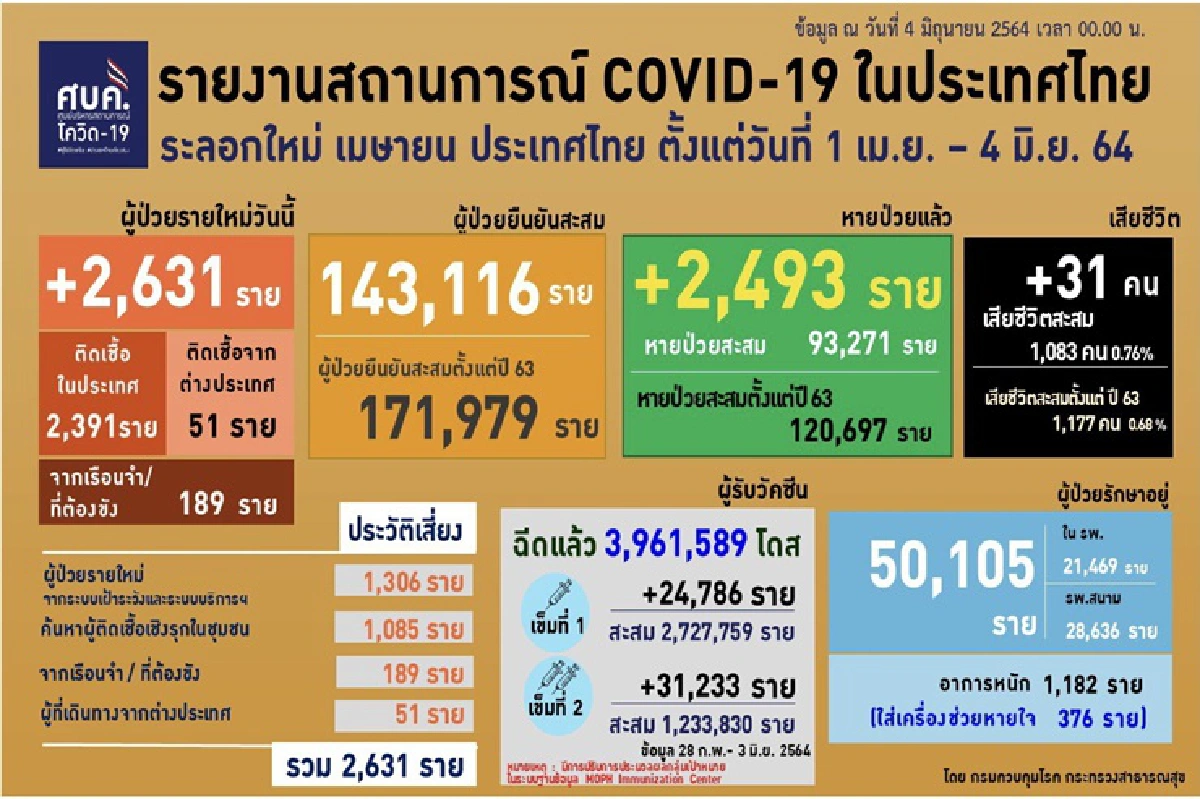 เมื่อวันที่ 4 มิ.ย. 64 ศูนย์บริหารสถานการณ์โควิด-19 รายงานสถานการณ์แพร่ระบาดของโรคติดเชื้อโควิด-19 ประจำวัน โดยมีรายละเอียดดังนี้