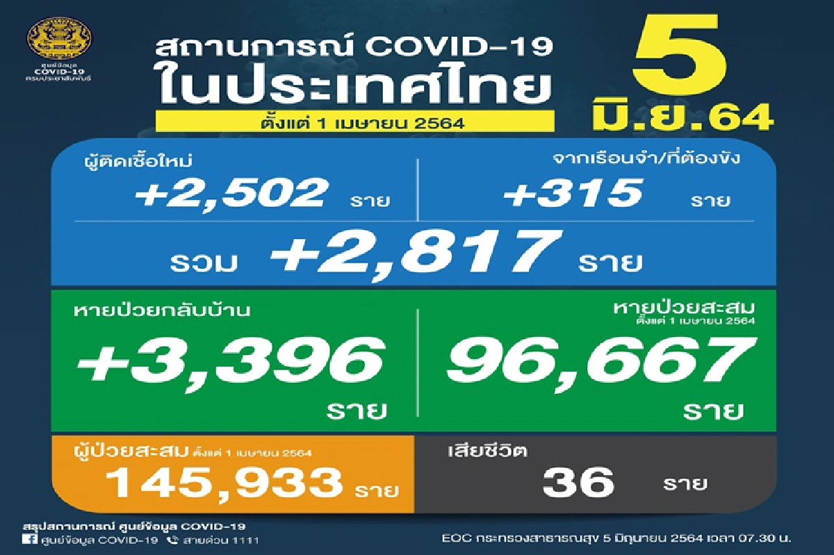 เมื่อวันที่ 5 มิ.ย. 64 ศูนย์บริหารสถานการณ์โควิด-19 (ศบค.) รายงานสถานการณ์ระบาดของโรคติดเชื้อโควิด-19 ดังนี้