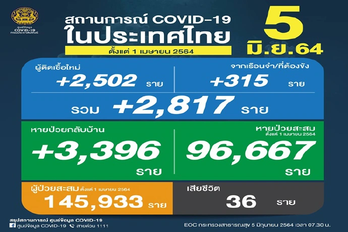 ศบค.เผยยอดป่วยโควิดใหม่ 2,817 เสียชีวิตอีก 36 ราย