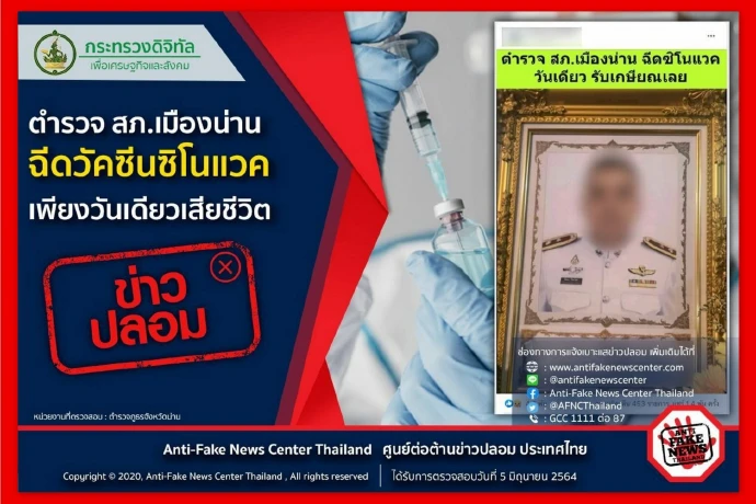 แอนตี้เฟกนิวส์เตือนข่าวปลอม ! ตำรวจสภ.เมืองน่านเสียชีวิตฉีดซิโนแวคแท้จริงเส้นเลือดหัวใจตีบและยังไม่เคยรับการฉีดวัคซีนโควิด
