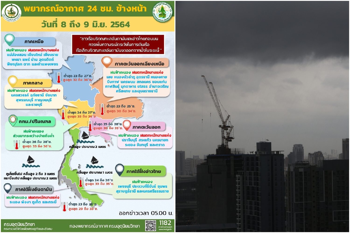 เมื่อวันที่ 8 มิ.ย. 64 กรมอุตุนิยมวิทยารายงาน ลักษณะอากาศทั่วไปว่า พยากรณ์อากาศ 24 ชั่วโมงข้างหน้า มรสุมตะวันตกเฉียงใต้มีกำลังปานกลางพัดปกคลุมทะเลอันดามัน ประเทศไทย และอ่าวไทย ประกอบกับมีหย่อมความกดอากาศต่ำยังคงปกคลุมบริเวณประเทศลาวตอนบนและอ่าวตังเกี๋ยประเทศเวียดนาม