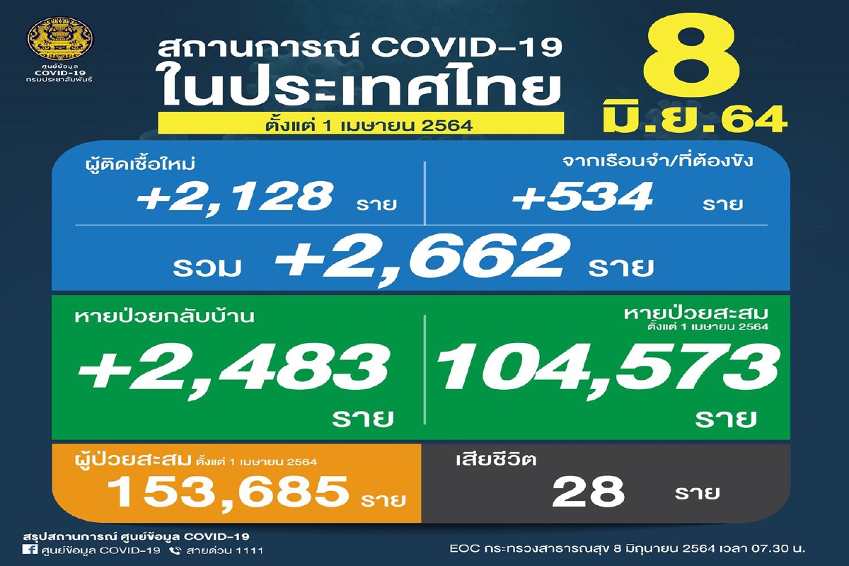 -ผู้ติดเชื้อเพิ่มขึ้น 2,662 ราย จำแนกเป็น ติดเชื้อใหม่ 2,128 ราย, ติดเชื้อภายในเรือนจำ/ที่ต้องขัง 534 ราย