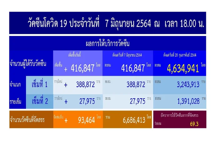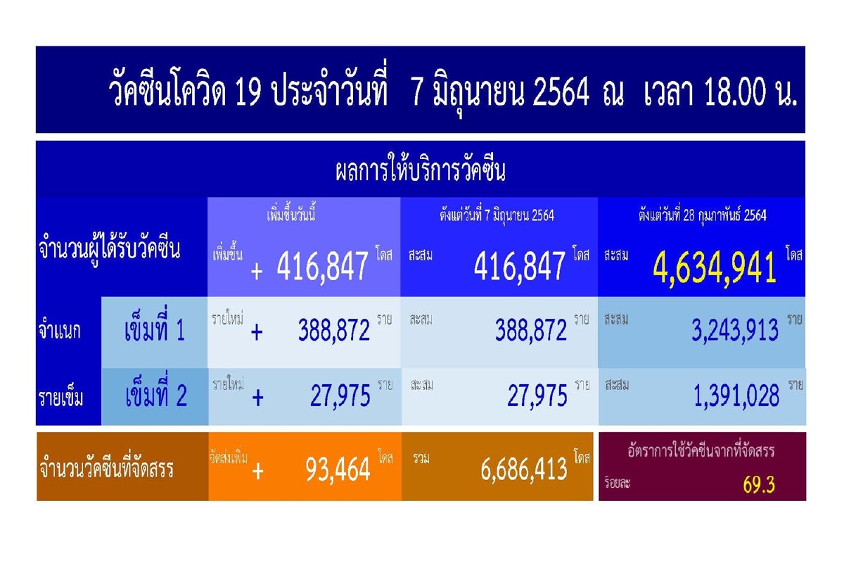 เมื่อวันที่ 8 มิ.ย. 64 นพ.ทวีศิลป์ วิษณุโยธิน โฆษกศูนย์บริหารสถานการณ์โควิด-19 (ศบค.) กล่าวระหว่างการแถลงสถานการณ์ระบาดของโรคติดเชื้อโควิด-19 ประจำวัน ว่า กรมควบคุมโรค ได้รายงานยอดการฉีดวัคซีนโควิด-19 ให้แก่ประชาชนในวันที่ 7 มิ.ย.64 ซึ่งเป็นวันแรกของปฏิบัติการปูพรมฉีดวัคซีนพร้อมกันทั่วประเทศ พบว่า สามารถฉีดวัคซีนไปได้ 416,847 โดส แยกเป็น เข็มที่ 1 จำนวน 388,872 ราย และเข็มที่ 2 จำนวน 27,975 ราย
