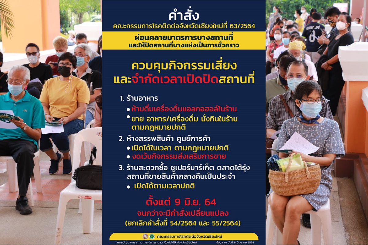 เมื่อวันที่ 9 มิ.ย. ที่ประชุมคณะกรรมการโรคติดต่อจังหวัดเชียงใหม่ มีมติออกคำสั่งคณะกรรมการโรคติดต่อจังหวัดเชียงใหม่ ที่ 63/2564 เรื่อง ผ่อนคลายมาตรการบางสถานที่และให้ปิดสถานที่บางแห่งเป็นการชั่วคราว โดยมีผลบังคับตั้งแต่วันที่ 9 มิ.ย.เป็นต้นไป