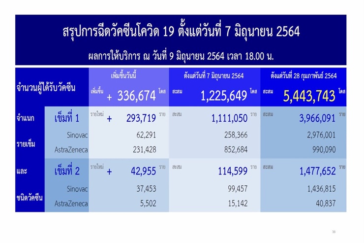 ทั้งนี้ หากนับตั้งแต่ประเทศไทยเริ่มฉีดวัคซีนโควิด-19 เมื่อวันที่ 28 ก.พ.64 จนถึง 9 มิ.ย.64 พบว่า มียอดฉีดวัคซีนสะสมแล้ว 5,443,743 โดส แยกเป็น เข็มที่ 1 จำนวน 3,966,091 ราย และเข็มที่ 2 จำนวน 1,477,652 ล้านราย