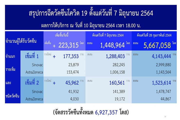 ศบค. เผย ยอดฉีดวัคซีนโควิด-19 วันที่ 10 มิย. 223,315 โดส รวมยอดปูพรมฉีดวัคซีนทั่วประเทศ 4 วัน ฉีดได้ 1,448,964 โดส ขณะที่ยอดรวมตั้งแต่ 28 ก.พ.64 ฉีดไปแล้ว 5,667,058 โดส