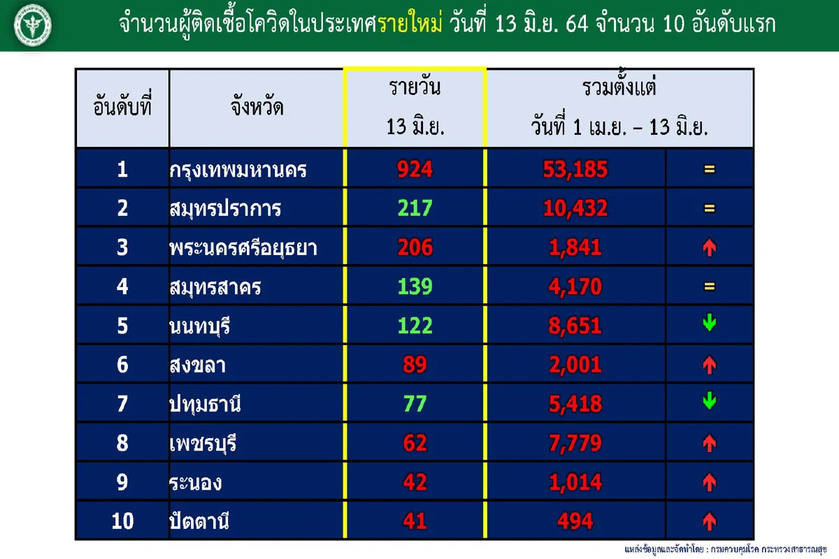 เมื่อวันที่ 13 มิ.ย. 64 ศูนย์บริหารสถานการณ์โควิด-19 (ศบค.) รายงานสถานการณ์การแพร่ระบาดของโรคติดเชื้อโควิด-19 ในประเทศประจำวันดังนี้
