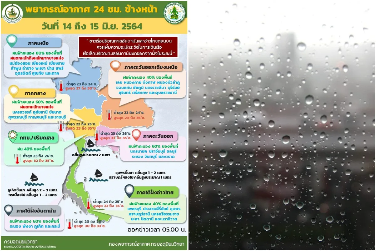เมื่อวันที่ 14 มิ.ย. 64 กรมอุตุนิยมวิทยารายงาน ลักษณะอากาศทั่วไปว่า พยากรณ์อากาศ 24 ชั่วโมงข้างหน้า ร่องมรสุมพาดผ่านตอนบนของภาคเหนือ เข้าสู่หย่อมความกดอากาศต่ำกำลังแรงบริเวณประเทศลาวตอนบน ประกอบกับมรสุมตะวันตกเฉียงใต้กำลังแรงยังคงพัดปกคลุมทะเลอันดามัน ประเทศไทย และอ่าวไทย