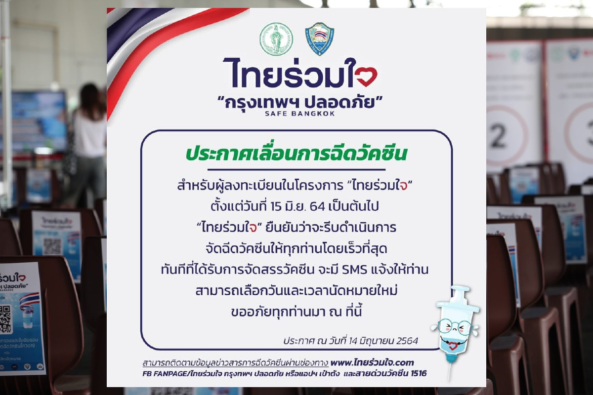 กทม.ประกาศเลื่อนการฉีดวัคซีนสำหรับผู้ลงทะเบียนในโครงการไทยร่วมใจตั้งแต่วันที่ 15 มิ.ย.64เป็นต้นไป แจงทันทีที่ได้รับการจัดสรรวัคซีนจะแจ้งผ่านSMSเพื่อนัดหมายใหม่