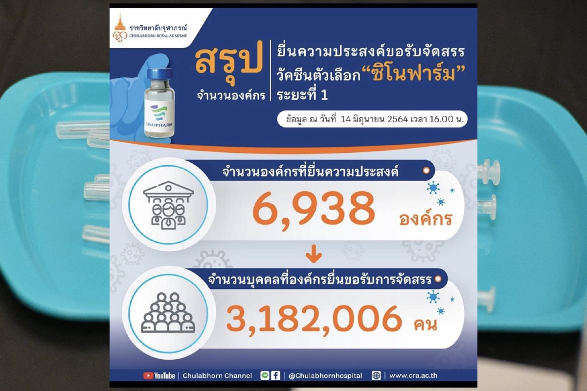 ราชวิทยาลัยจุฬาภรณ์ มีองค์ยื่นความประสงค์ขอรับวัคซีน "ซิโนฟาร์ม" ระยะที่1 จำนวน 6,938 องค์กร รวมจำนวนบุคคล 3,182,006 คน