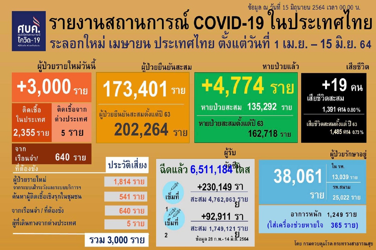 -พบผู้ติดเชื้อรายใหม่ 3,000 ราย เป็นการติดเชื้อในประเทศ 2,355 ราย มาจากระบบเฝ้าระวังและระบบบริการ 1,841 ราย มาจากการค้นหาเชิงรุกในชุมชน 541 ราย จากเรือนจำและที่ต้องขัง 640 ราย และเป็นผู้เดินทางมาจากต่างประเทศ 5 ราย จำนวนนี้มี 1 รายเป็นผู้เดินทางจากกัมพูชาด้วยช่องทางธรรมชาติ