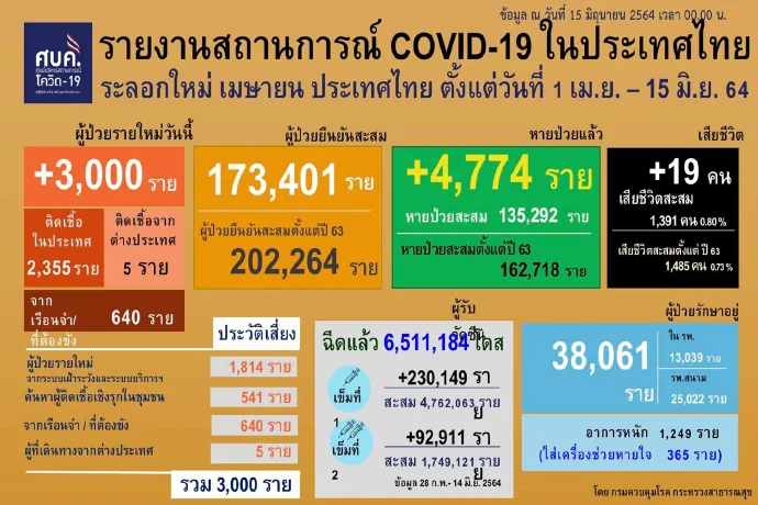 เมื่อวันที่ 15 มิ.ย. 64 พญ.อภิสมัย ศรีรัสรรค์ ผู้ช่วยโฆษกศูนย์บริหารสถานการณ์โควิด-19 (ศบค.) แถลงสถานการณ์ระบาดของโรคติดเชื้อโควิด-19 ประจำวันดังนี้
