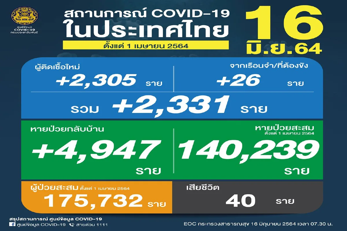 ศบค.รายงานไทยติดเชื้อโควิดเพิ่มขึ้น 2,331 ราย เสียชีวิตอีก 40 ราย ขณะที่ผู้ป่วยรักษาหายกลับบ้านเพิ่ม 4,947 ราย