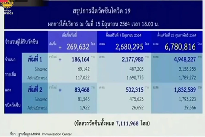 ศบค. เผย ยอดฉีดวัคซีนโควิด-19 วันที่ 15 มิย. 269,632 โดส รวมยอดปูพรมฉีดวัคซีนทั่วประเทศ 9วัน ฉีดได้ 2,680,295 โดส ขณะที่ยอดรวมตั้งแต่ 28 ก.พ.64 ฉีดไปแล้ว 6,780,816 โดส