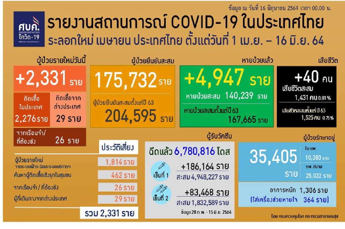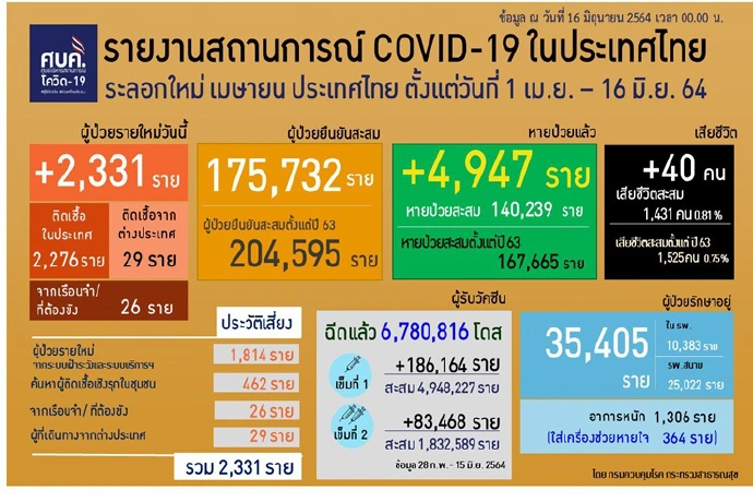 เมื่อวันที่ 16 มิ.ย. 64 ศูนย์บริหารสถานการณ์โควิด-19 รายงานสถานการณ์แพร่ระบาดของโรคติดเชื้อโควิด-19 ประจำวัน โดยมีรายละเอียดดังนี้
