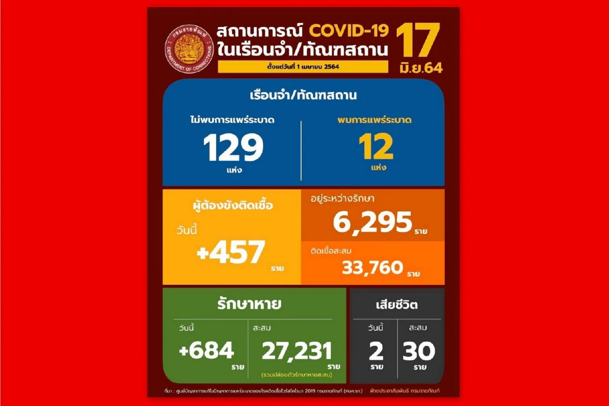 นายอายุตม์ สินธพพันธุ์ อธิบดีกรมราชทัณฑ์ กล่าวว่า ได้รับรายงานว่า ข้อมูลวันที่ 16มิ.ย พบผู้ต้องขังติดเชื้อรายใหม่ จำนวน 457 ราย รักษาหาย 684 ราย เสียชีวิต 2 ราย และมียอดผู้ต้องขังติดเชื้อที่ยังอยู่ในการดูแลของกรมราชทัณฑ์ 6,295 ราย ส่วน ภาพรวมไม่พบปัญหาการแพร่นะบาดเชื้อโควิด-19 ในเรือนจำ-ทัณฑสถานที่เป็นเรือนจำสีขาว จำนวน 129 แห่ง และพบเรือนจำสีแดงที่ยังมีการแพร่ระบาด 12 แห่ง พบผู้ติดเชื้อรายใหม่ในวันนี้ มีจำนวนเพิ่มขึ้นจากการ SWAB เพื่อตรวจหาเชื้อซ้ำในเรือนจำ-ทัณฑสถานที่เป็นเรือนจำสีแดงทั้งหมด มีผตข.หายป่วยสะสม 27,231 ราย หรือ 80% ของผู้ติดเชื้อสะสมทั้งหมด และมีผู้เสียชีวิต 2 ราย ได้เข้ารับการรักษาตัวที่ทัณฑสถานโรงพยาบาลราชทัณฑ์