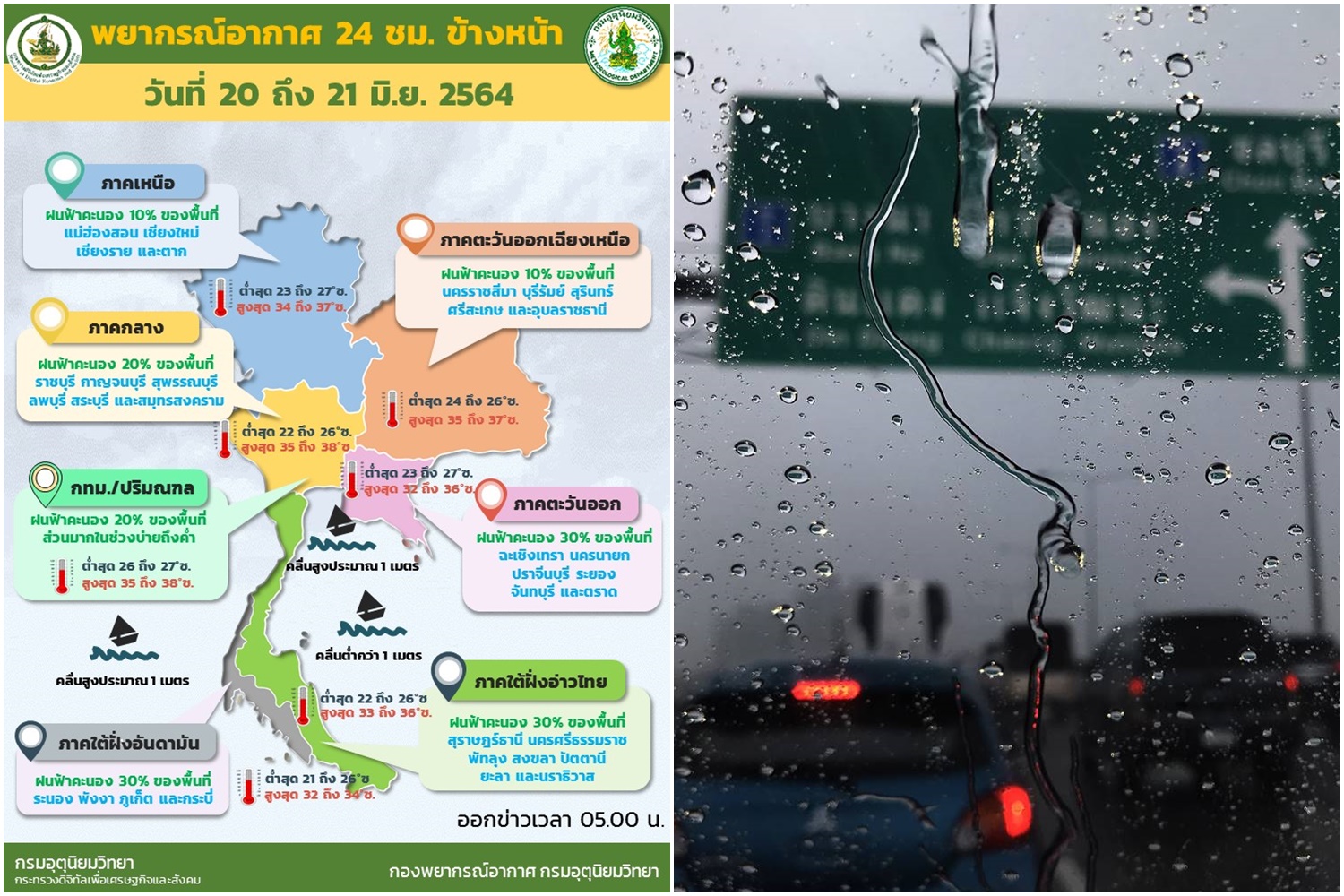 เมื่อวันที่ 20 มิ.ย.64 กรมอุตุนิยมวิทยารายงาน ลักษณะอากาศทั่วไปว่า พยากรณ์อากาศ 24 ชั่วโมงข้างหน้า มรสุมตะวันตกเฉียงใต้กำลังอ่อนพัดปกคลุมทะเลอันดามัน ประเทศไทย และอ่าวไทย ทำให้ประเทศไทย มีฝนฟ้าคะนองบางพื้นที่ ส่วนคลื่นลมบริเวณทะเลอันดามันและอ่าวไทยตอนบนมีกำลังอ่อน