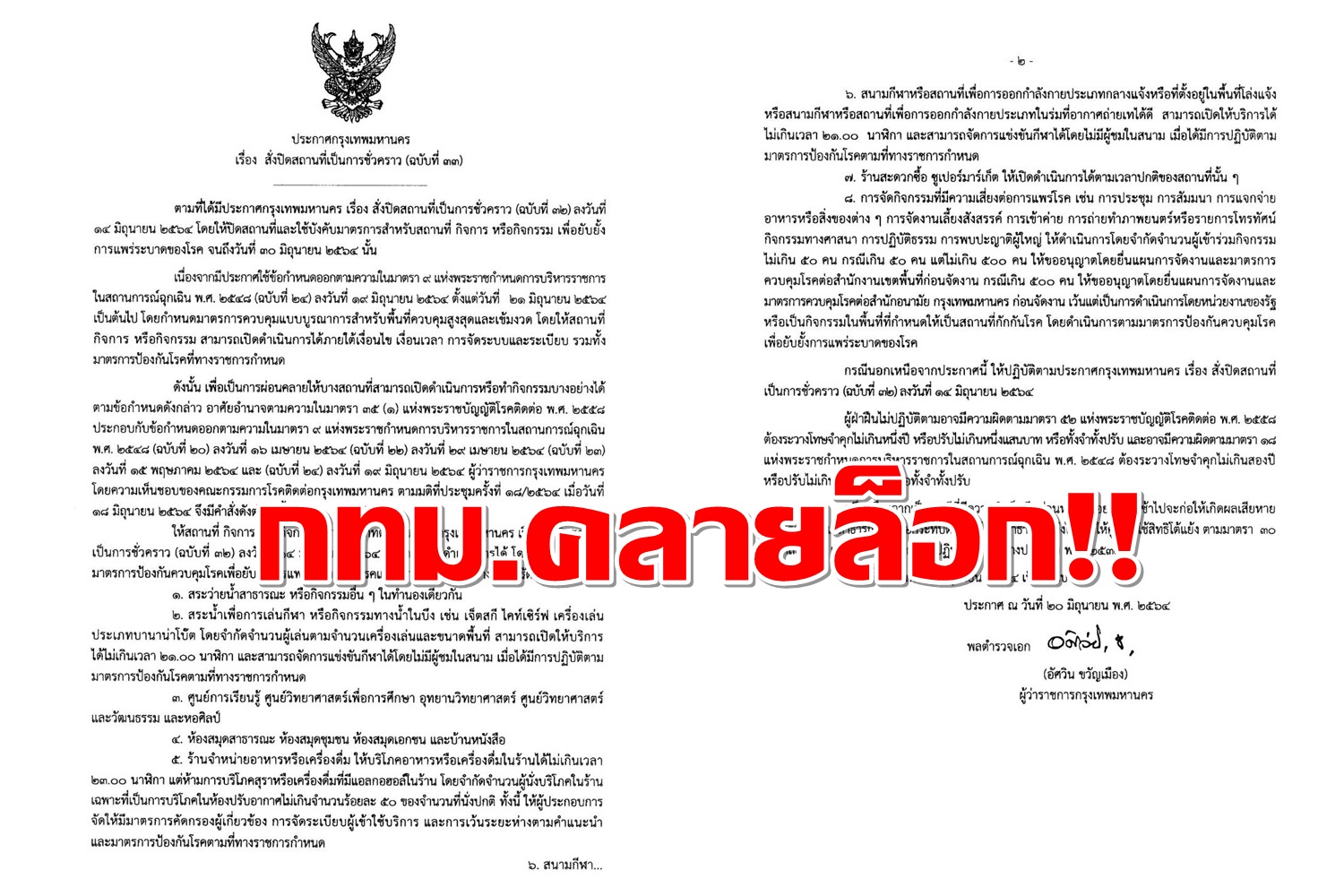 ผู้ว่าฯกทม.ออกประกาศคลายล็อกให้บางสถานที่สามารถเปิดดำเนินการหรือทำกิจกรรมบางอย่างได้ ร้านสะดวกซื้อเปิดบริการได้ตามปกติแล้วไม่จำกัดเวลา