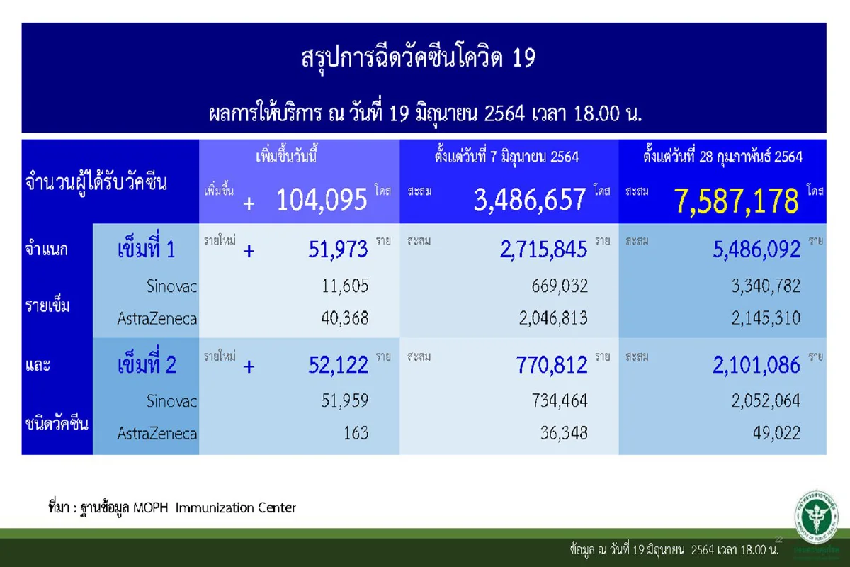 -ยอดสะสมผู้ได้รับวัคซีนตั้งแต่วันที่ 28 ก.พ.64 รวม 7,587,178 คน แบ่งเป็น เข็มที่ 1 จำนวน 5,486,092 คน เข็มที่ 2 จำนวน 2,101,086 คน