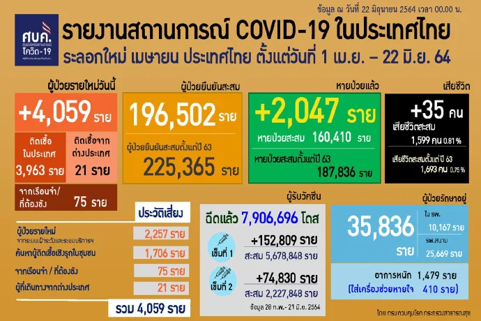 เมื่อวันที่ 22 มิ.ย. 64 ศูนย์บริหารสถานการณ์โควิด-19 (ศบค.) รายงานสถานการณ์การแพร่ระบาดของโรคติดเชื้อโควิด-19 ประจำวันดังนี้