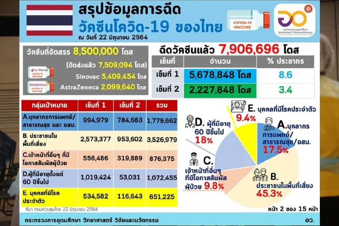 เมื่อวันที่ 22 มิถุนายน กระทรวงการอุดมศึกษา วิทยาศาสตร์ วิจัยและนวัตกรรม (อว.) รายงานข้อมูลสถิติการฉีดวัคซีนโควิด-19 สำหรับประเทศไทยข้อมูล ณ วันที่ 22 มิถุนายน 2564 ได้ฉีดวัคซีนแล้วกว่า 7,906,696  โดส โดยฉีดให้กับประชาชนในพื้นที่เสี่ยงมากที่สุดในสัดส่วนกว่า 45.3% พร้อมรายงานสถิติที่สำคัญ คือ