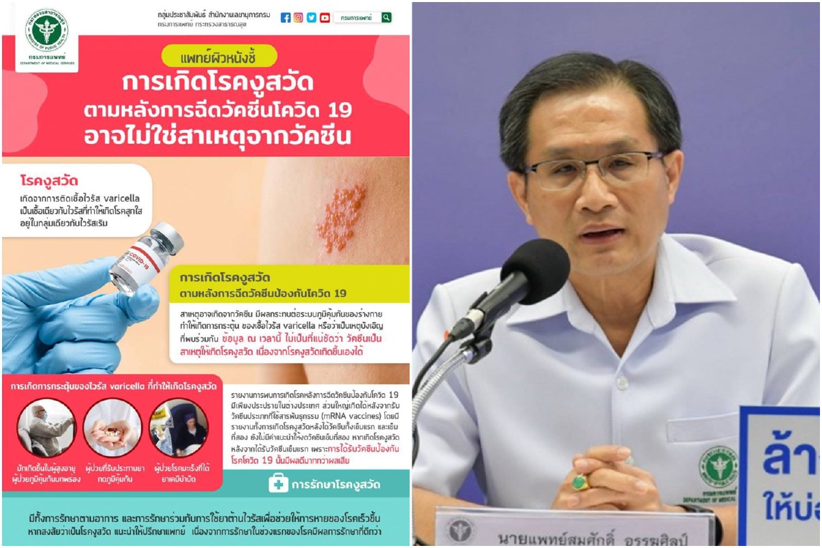 เมื่อวันที่ 23 มิ.ย. 64 นายแพทย์สมศักดิ์ อรรฆศิลป์ อธิบดีกรมการแพทย์ เปิดเผยว่า ตามที่มีข่าวเผยแพร่ใน Social เรื่องการเกิดโรคงูสวัดตามหลังการฉีดวัคซีนโควิด 19 นั้น ขอเรียนว่า โรคงูสวัดเป็นโรคที่เกิดจากการติดเชื้อไวรัส varicella ซึ่งเป็นเชื้อเดียวกับไวรัสที่ทำให้เกิดโรคสุกใส และเป็นไวรัสที่อยู่ในกลุ่มเดียวกับไวรัสเริม โดยที่ผู้ป่วยเมื่อเป็นโรคสุกใสแล้วเมื่อหายจากโรค เชื้อไวรัสจะเข้าไปซ่อนในปมประสาท และจะถูกกระตุ้นเมื่อร่างกายมีภูมิคุ้มกันที่อ่อนแอ ซึ่งไวรัสจะมีการแบ่งตัวทำให้การปล่อยเชื้อไวรัสออกมาตามแนวเส้นประสาท จะมีอาการแสดงเบื้องต้นคือปวดแสบปวดร้อนที่ผิวหนังซึ่งถูกควบคุมโดยแนวเส้นประสาทนั้น