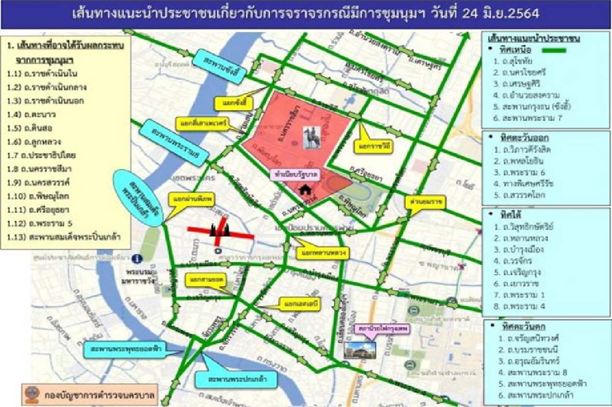 1. เส้นทางที่อาจได้รับผลกระทบจากการชุมนุมฯและควรหลีกเลี่ยง ถ.ราชดำเนินใน ถ.ราชดำเนินกลาง ถ.ราชดำเนินนอก ถ.ตะนาว ถ.ดินสอ ถ.ลูกหลวง ถ.ประชาธิปไตย ถ.นครราชสีมา ถ.นครสวรรค์ ถ.พิษณุโลก ถ.ศรีอยุธยา ถ.พระราม 5 สะพานสมเด็จพระปิ่นเกล้า