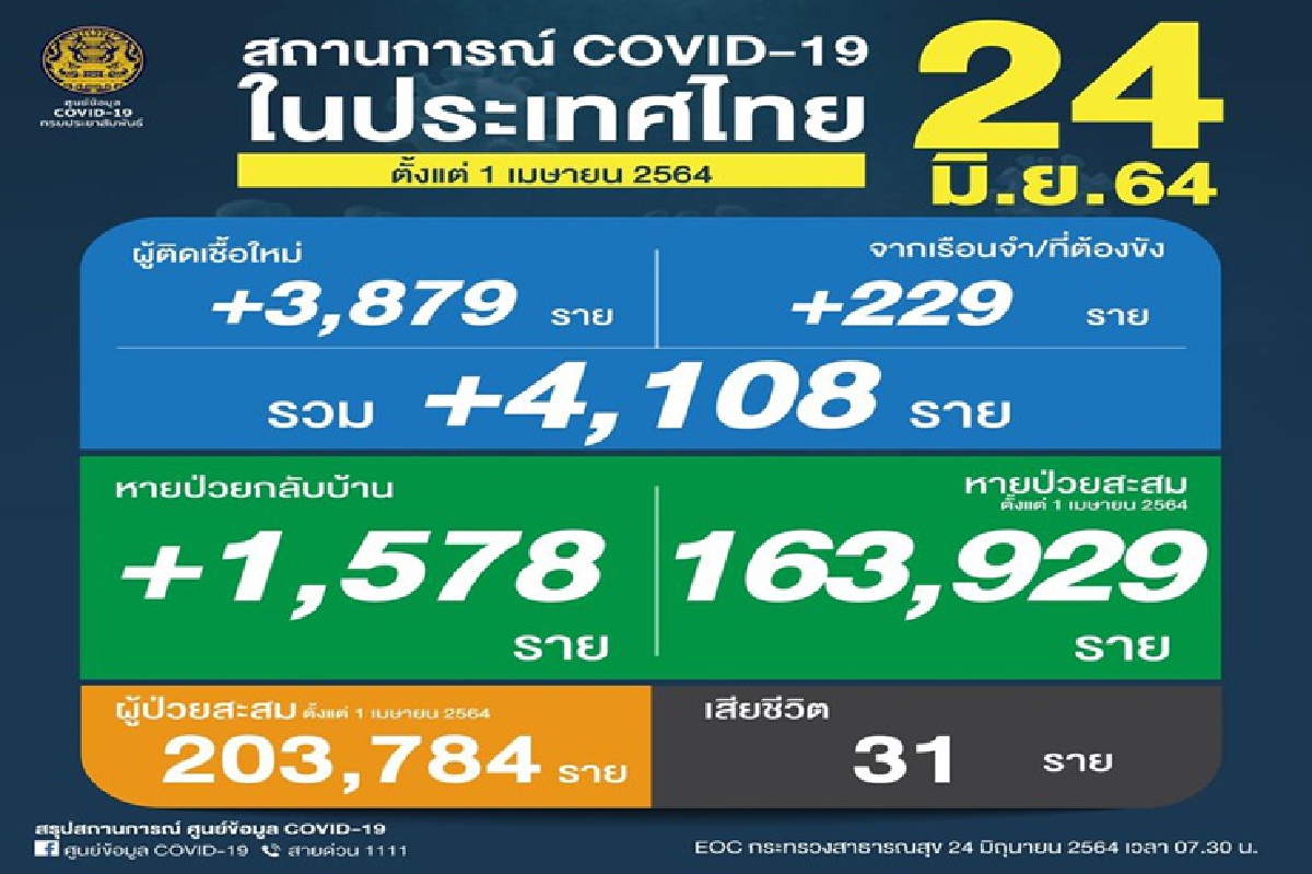 -ผู้ติดเชื้อเพิ่มขึ้นรวม 4,108 ราย จำแนกเป็น ติดเชื้อใหม่ 3,879 ราย ติดเชื้อภายในเรือนจำ/ที่ต้องขัง229 ราย