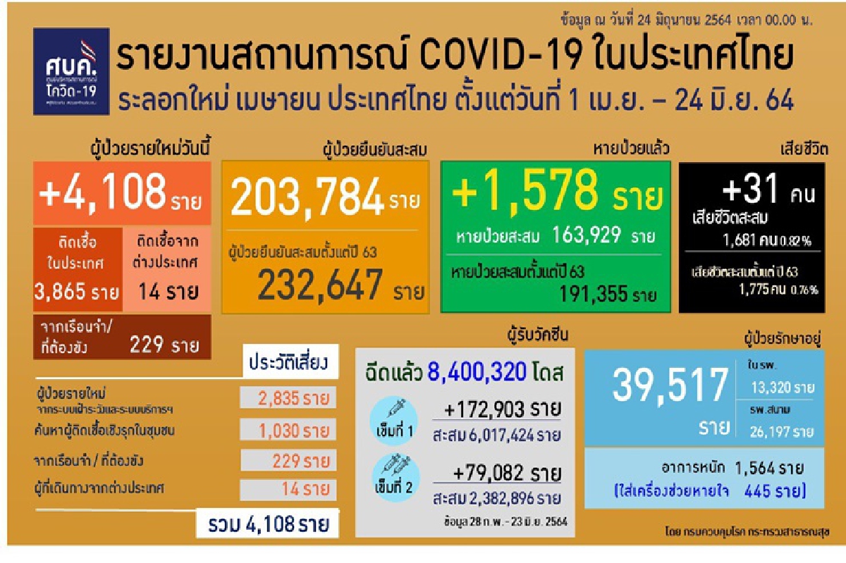 เมื่อวันที่ 24 มิ.ย. 64 ศูนย์บริหารสถานการณ์การแพร่ระบาดของโรคติดเชื้อไวรัสโคโรนา 2019 (โควิด-19) หรือ ศบค. แถลงสถานการณ์แพร่ระบาดของโรคติดเชื้อโควิด-19 ประจำวัน โดยมีรายละเอียดดังนี้