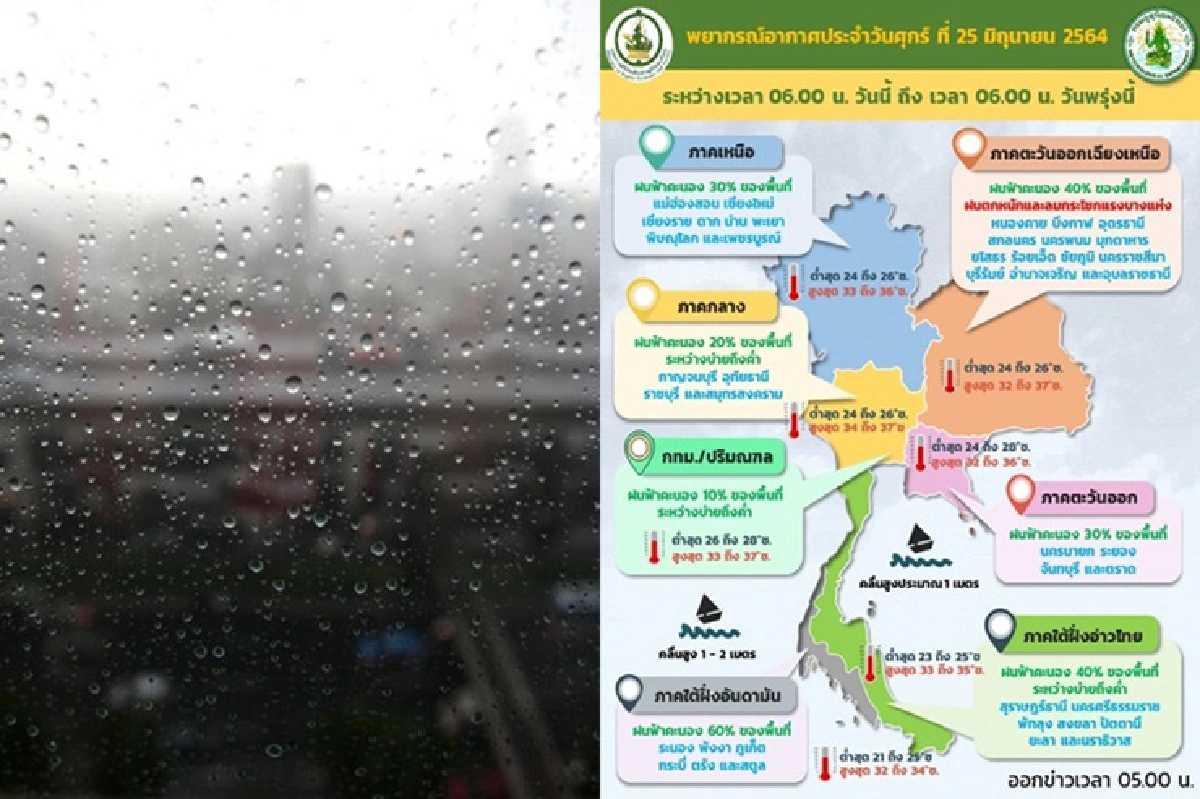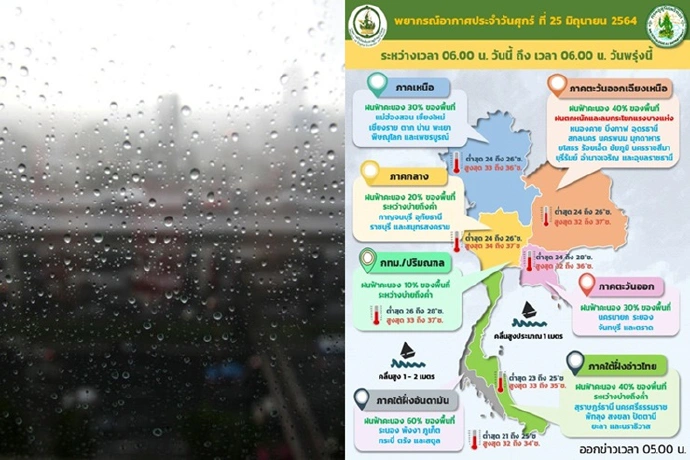 กรมอุตุนิยมวิทยา พยากรณ์อากาศประจำวันที่ 25 มิ.ย. 2564 ลักษณะอากาศทั่วไป พยากรณ์อากาศ 24 ชั่วโมงข้างหน้า มรสุมตะวันตกเฉียงใต้พัดปกคลุมทะเลอันดามัน ประเทศไทย และอ่าวไทย ประกอบกับยังคงมีหย่อมความกดอากาศต่ำปกคลุมประเทศลาวและเวียดนามตอนบน ลักษณะเช่นนี้ทำให้บริเวณประเทศไทยตอนบนมีการกระจายของฝนน้อย เว้นแต่บริเวณรับลมมรสุมตะวันตกเฉียงใต้ และภาคตะวันออกเฉียงเหนือ ส่วนคลื่นลมบริเวณทะเลอันดามันและอ่าวไทยตอนบนมีคลื่นสูง 1-2 เมตร บริเวณที่มีฝนฟ้าคะนองคลื่นสูงประมาณ 2 เมตร