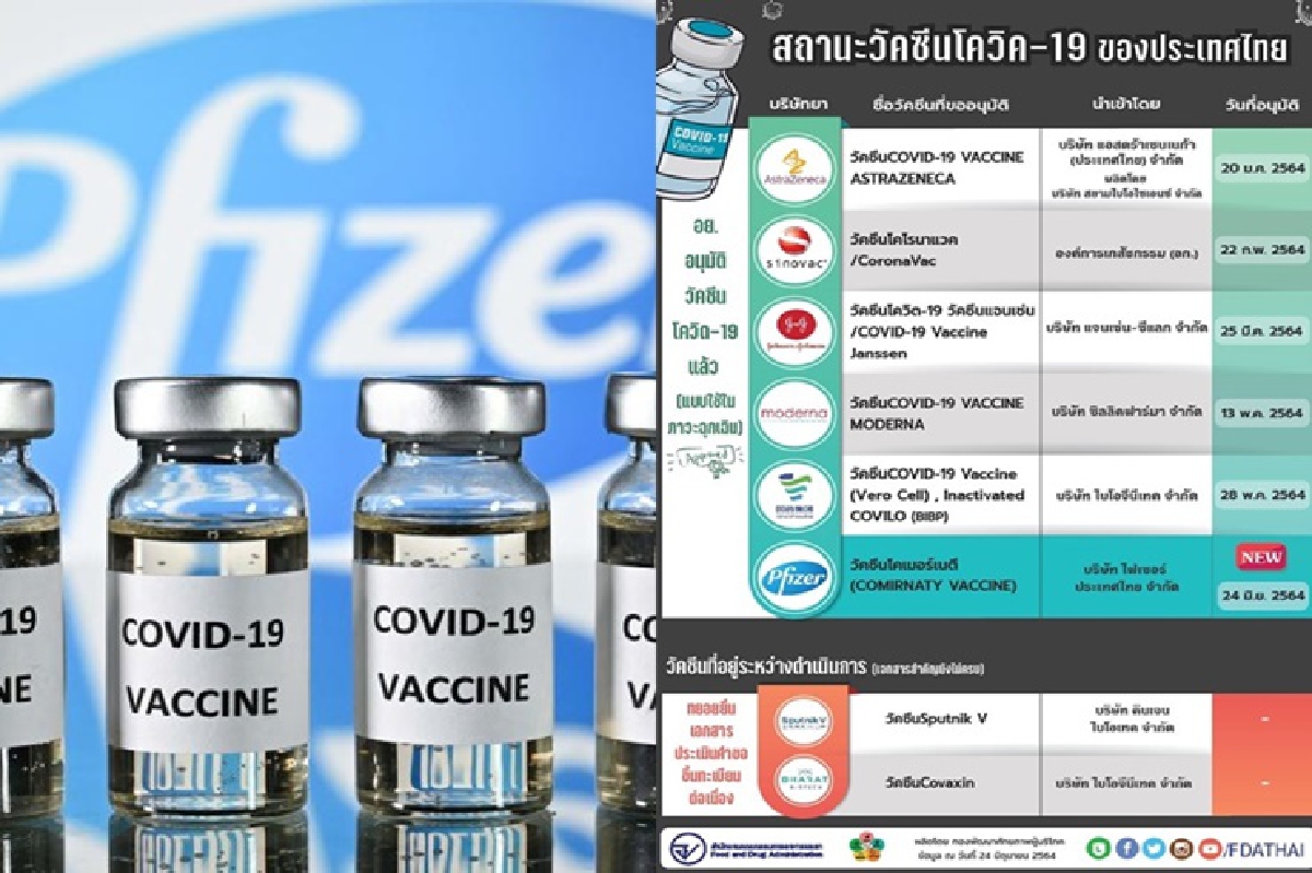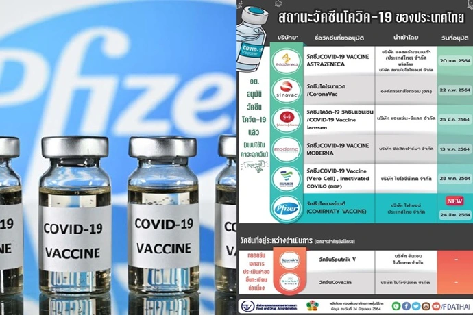 นายแพทย์ไพศาล ดั่นคุ้ม เลขาธิการคณะกรรมการอาหารและยา เปิดเผยว่า สำนักงานคณะกรรมการอาหารและยา (อย.) ได้อนุมัติขึ้นทะเบียนวัคซีนโคเมอร์เนตี (COMIRNATY VACCINE) ซึ่งเป็นวัคซีนของบริษัท ไฟเซอร์ จำกัด นำเข้าโดย บริษัท ไฟเซอร์ ประเทศไทย จำกัด โดยเป็นวัคซีนโควิด-19 รายการที่ 6 ของไทย เป็นที่เรียบร้อยแล้ว หลังจาก อย. ได้อนุมัติวัคซีนโควิด-19 ไปแล้ว 5 ราย ได้แก่ วัคซีนแอสตร้าเซนเนก้า โดยบริษัท แอสตร้าเซนเนก้า (ประเทศไทย) จำกัด และที่ผลิตในประเทศ โดยบริษัท สยามไบโอไซเอนซ์ จำกัด วัคซีนโคโรนาแวค ของบริษัท ซิโนแวค ไลฟ์ไซเอ็นซ์ จำกัด นำเข้าโดยองค์การเภสัชกรรม วัคซีนจอห์นสันแอนด์จอห์นสัน โดยบริษัท แจนเซ่น ซีแลค จำกัด วัคซีนโมเดอร์นา นำเข้าโดยบริษัท ซิลลิค ฟาร์มา จำกัด และวัคซีนของซิโนฟาร์ม นำเข้าโดยบริษัท ไบโอจีนีเทค จำกัด