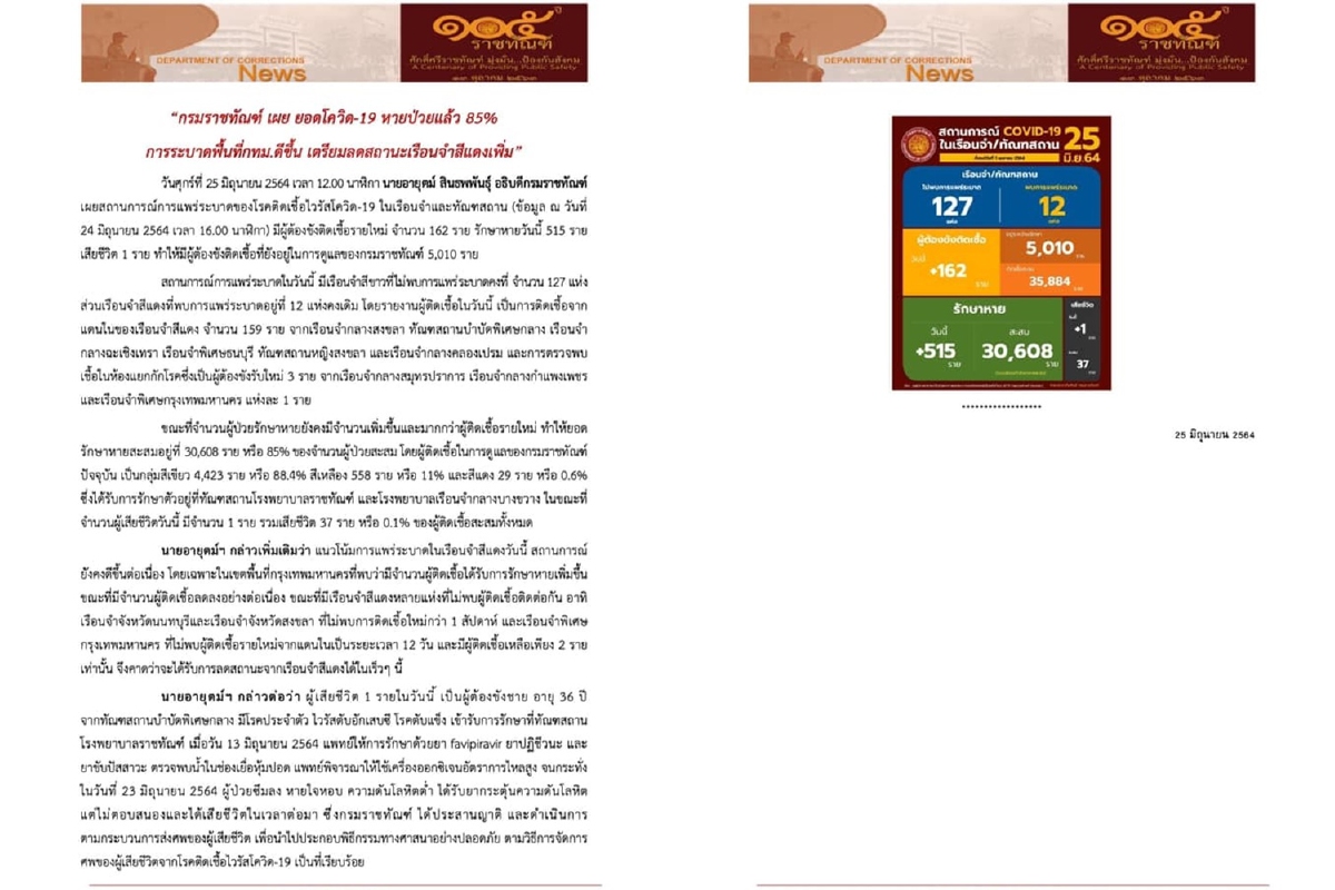 นายอายุตม์ สินธพพันธุ์ อธิบดีกรมราชทัณฑ์ เปิดเผยสถานการณ์การแพร่ระบาดของโรคติดเชื้อไวรัสโควิด-19 ในเรือนจำและทัณฑสถานว่า ข้อมูลของวันที่ 24 มิ.ย. พบผู้ต้องขังติดเชื้อรายใหม่ จำนวน 162 ราย แยกเป็นการติดเชื้อจากแดนในของเรือนจำสีแดง จำนวน 159 ราย และจากการตรวจพบเชื้อผู้ต้องขังรับใหม่ในห้องแยกกักโรคที่เรือนจำกลางสมุทรปราการ เรือนจำกลางกำแพงเพชร และเรือนจำพิเศษกรุงเทพมหานคร แห่งละ 1 ราย มีผู้ป่วยรักษาหาย 515 ราย เสียชีวิต 1 ราย ทำให้มีผู้ต้องขังติดเชื้อที่อยู่ในการดูแลของกรมราชทัณฑ์ 5,010 รายในเรือนจำที่พบการแพร่ระบาด 12 แห่ง และมีเรือนจำสีขาวที่ไม่พบการแพร่ระบาดคงที่ จำนวน 127 แห่ง ขณะที่จำนวนผู้ป่วยรักษาหายยังมีจำนวนเพิ่มขึ้นและมากกว่าผู้ติดเชื้อรายใหม่ ทำให้ยอดรักษาหายสะสมอยู่ที่ 30,608 ราย หรือ 85% ของจำนวนผู้ป่วยสะสม ซึ่งผู้ติดเชื้อในการดูแลของกรมราชทัณฑ์ปัจจุบัน เป็นกลุ่มสีเขียว 4,423 ราย หรือ 88.4% สีเหลือง 558 ราย หรือ 11% และสีแดง 29 ราย หรือ 0.6% ส่วนจำนวนผู้เสียชีวิตรวม 37 ราย หรือ 0.1% ของผู้ติดเชื้อสะสมทั้งหมด