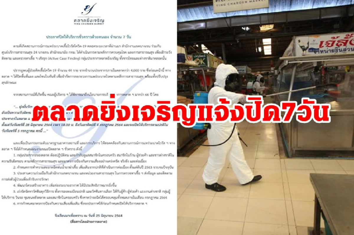 "ตลาดยิ่งเจริญ" แจ้งปิดให้บริการชั่วคราว ตั้งแต่ 28 มิ.ย.-4 ก.ค.64 รวม 7 วัน หลังพบผู้ป่วยติดเชื้อโควิด-19 จำนวน 44 ราย เร่งเดินหน้าจัดหาวัคซีนฉีดเพื่อสร้างภูมิคุ้มกันหมู่