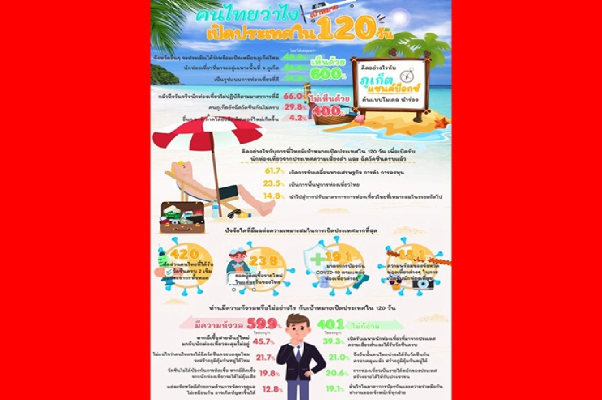 สุดท้ายเมื่อถามว่า ท่านมีความกังวลหรือไม่อย่างไรกับเป้าหมายเปิดประเทศใน 120 วัน พบว่าคนไทยส่วนใหญ่ ร้อยละ 59.9 ระบุว่ากังวล (โดยระบุว่า หากมีเชื้อสายพันธุ์ใหม่มากับนักท่องเที่ยวจะคุมไม่อยู่ และไม่แน่ใจว่าคนไทยจะได้ฉีดวัคซีนครอบคลุมไหมจะสร้างภูมิคุ้มกันหมู่ได้ไหม) ขณะที่ร้อยละ 40.1 ระบุว่าไม่กังวล (โดยระบุว่า เป็นการเปิดรับเฉพาะนักท่องเที่ยวที่มาจากประเทศความเสี่ยงต่ำและได้รับวัคซีนครบ และ ถึงวันนั้นคนไทยน่าจะได้รับวัคซีนกันครอบคลุมแล้ว สร้างภูมิคุ้มกันหมู่ได้)