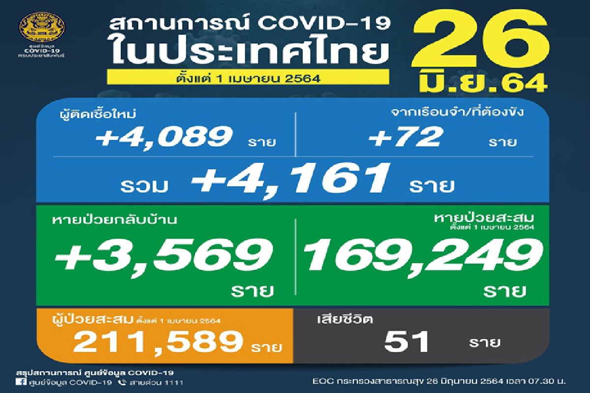 -ผู้ติดเชื้อเพิ่มขึ้นรวม 4,161 ราย จำแนกเป็น ติดเชื้อใหม่ 4,089 ราย ติดเชื้อภายในเรือนจำ/ที่ต้องขัง72 ราย