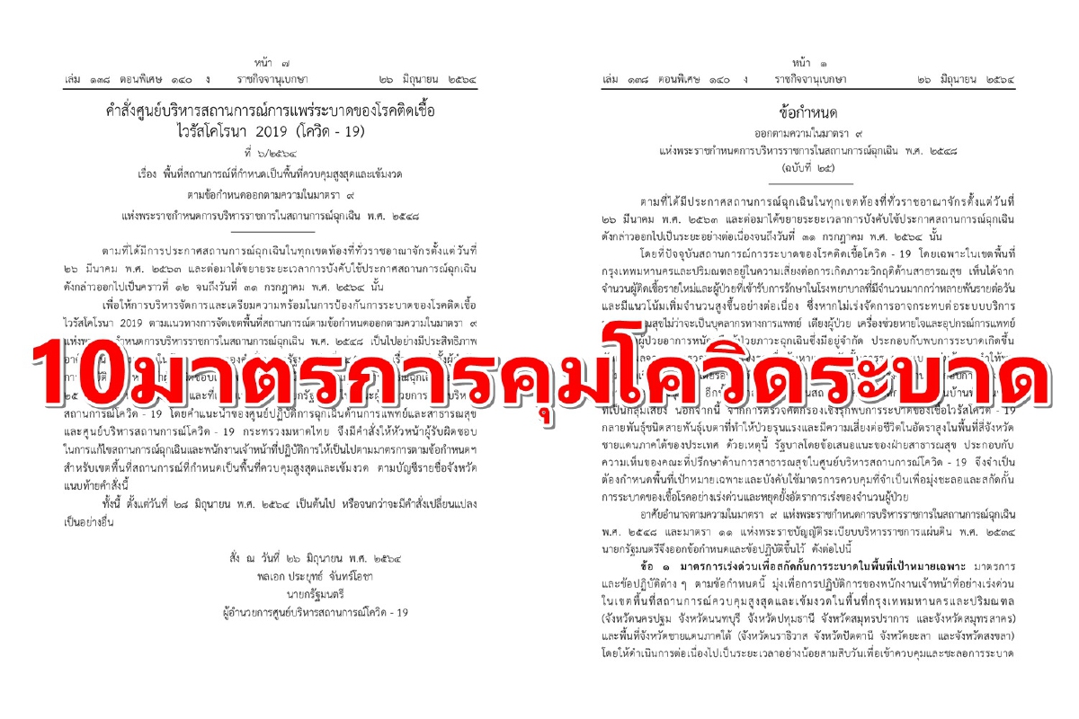 เมื่อวันที่ 26 มิ.ย. 64 ราชกิจจานุเบกษาได้เผยแพร่ คำสั่งและข้อกำหนด ศูนย์บริหารสถานการณ์การแพร่ระบาดของโรคติดเชื้อไวรัสโคโรนา 2019 (โควิด - 19) จำนวน 2 ฉบับ เพื่อควบคุมการแพร่ระบาดของโรคติดเชื้อโควิด-19 ดังนี้