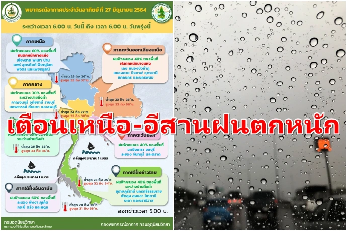เมื่อวันที่ 27 มิ.ย. 64 กรมอุตุนิยมวิทยารายงาน ลักษณะอากาศทั่วไปดังนี้ พยากรณ์อากาศ 24 ชั่วโมงข้างหน้า หย่อมความกดอากาศต่ำปกคลุมบริเวณประเทศลาวและเวียดนามตอนบน ลักษณะเช่นนี้ทำให้บริเวณภาคเหนือ และภาคตะวันออกเฉียงเหนือมีฝนตกหนักบางพื้นที่ ในขณะที่มรสุมตะวันตกเฉียงใต้ยังคงพัดปกคลุมทะเลอันดามัน ประเทศไทย และอ่าวไทย ทำให้ภาคใต้ยังคงมีฝนฟ้าคะนองเกิดขึ้นในระยะนี้