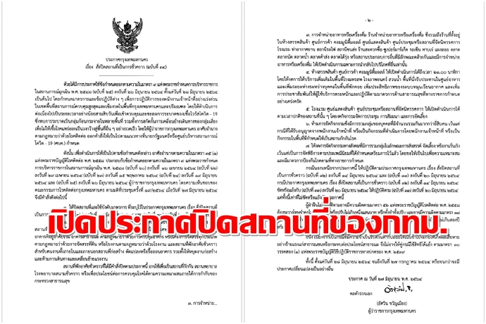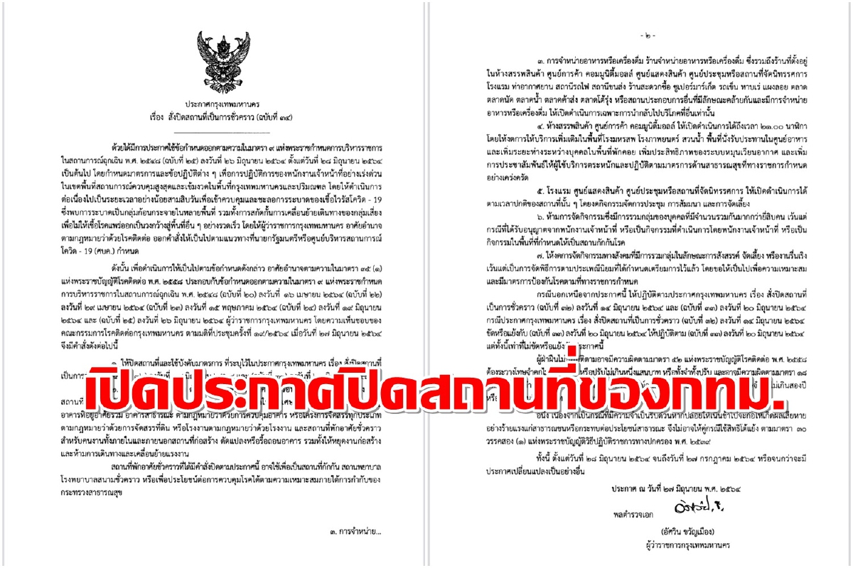 เมื่อวันที่ 27 มิ.ย.พล.ต.อ.อัศวิน ขวัญเมือง ผู้ว่าฯกทม.ลงนามในประกาศกรุงเทพมหานครเรื่อง สั่งปิดสถานที่เป็นการชั่วคราว (ฉบับที่ 34) ยกระดับเข้มมาตรการในกรุงเทพฯ เพื่อแก้ไขและระงับยับยั้งการแพร่ระบาดของโรคโควิด-19 มีรายละเอียดสาระสำคัญ5 เรื่องคือ