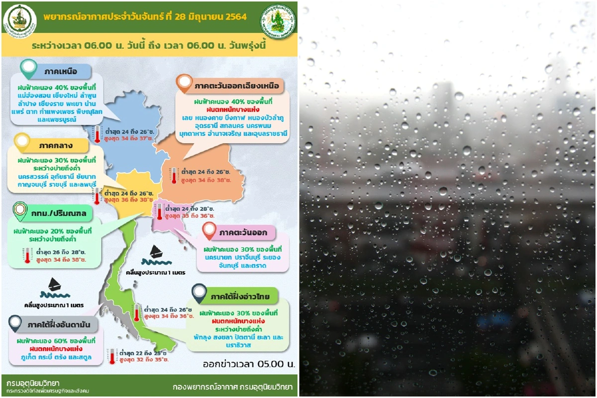 เมื่อวันที่ 28 มิ.ย. 64 กรมอุตุนิยมวิทยารายงาน ลักษณะอากาศทั่วไป ว่า พยากรณ์อากาศ 24 ชั่วโมงข้างหน้า หย่อมความกดอากาศต่ำยังคงปกคลุมบริเวณประเทศลาวและเวียดนามตอนบน ลักษณะเช่นนี้ทำให้ภาคตะวันออกเฉียงเหนือตอนบนมีฝนตกหนักบางพื้นที่ ในขณะที่มรสุมตะวันตกเฉียงใต้พัดปกคลุมทะเลอันดามัน ประเทศไทย และอ่าวไทย ทำให้ภาคเหนือ ภาคกลาง และภาคตะวันออกมีฝนฟ้าคะนองเกิดขึ้นในระยะนี้ โดยมีฝนตกหนักบางแห่งในภาคใต้ส่วนคลื่นลมบริเวณทะเลอันดามันและอ่าวไทยตอนบนมีคลื่นสูงประมาณ 1 เมตร บริเวณที่มีฝนฟ้าคะนองคลื่นสูง 1-2 เมตร