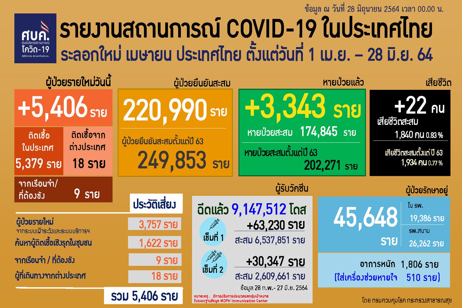 เมื่อวันที่ 28 มิ.ย. 64 ศูนย์บริหารสถานการณ์โควิด-19 (ศบค.) รายงานสถานการณ์การแพร่ระบาดของโรคติดเชื้อโควิด-19 ในประเทศดังนี้