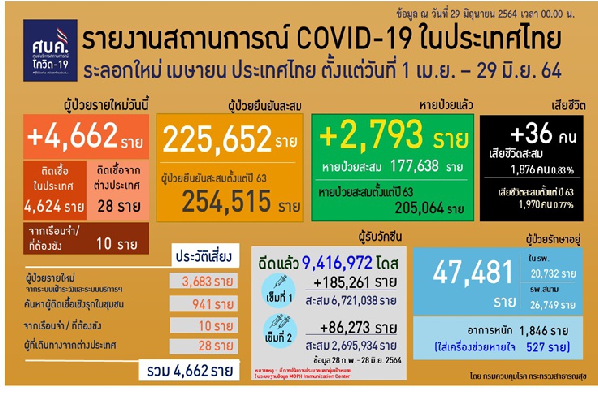เมื่อวันที่ 29 มิ.ย. 64 ศูนย์บริหารสถานการณ์การแพร่ระบาดของโรคติดเชื้อไวรัสโคโรนา 2019 (โควิด-19) หรือ ศบค. รายงาน สถานการณ์แพร่ระบาดของโรคติดเชื้อโควิด-19 ประจำวัน โดยมีรายละเอียดดังนี้