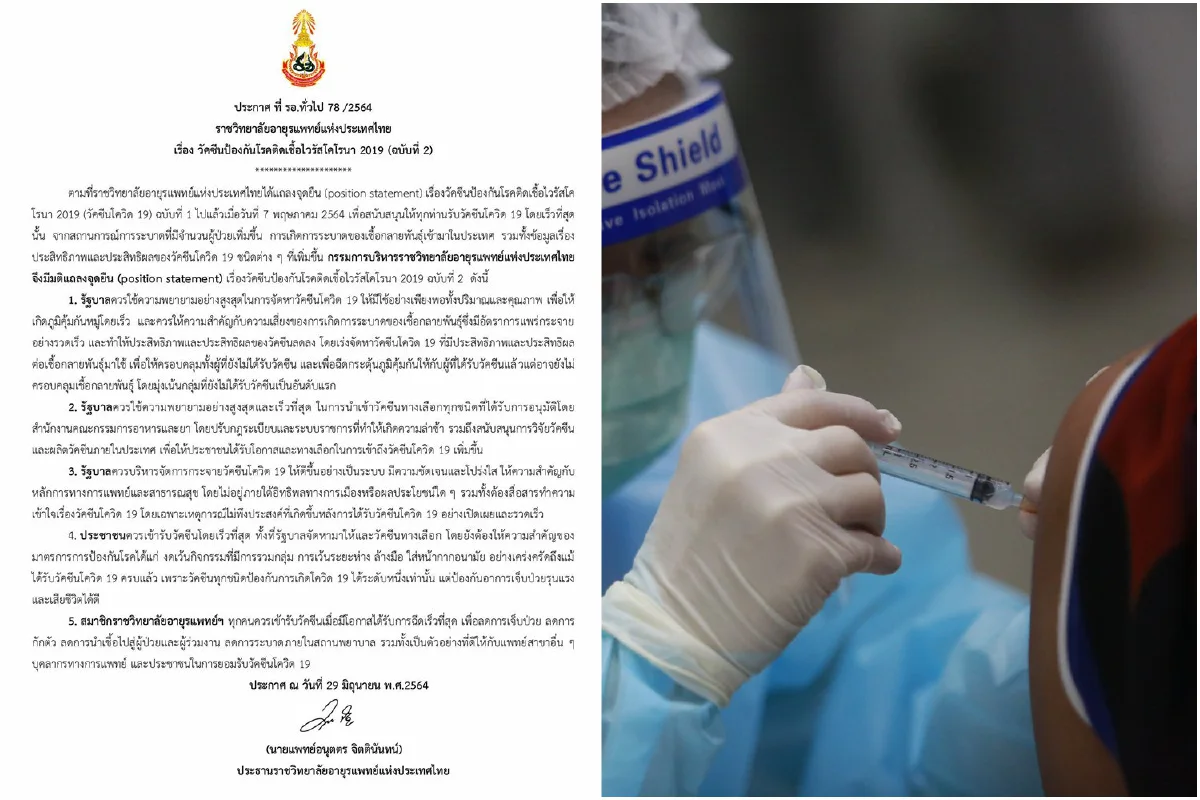 เมื่อวันที่ 29 มิ.ย. 64 ราชวิทยาลัยอายุรแพทย์แห่งประเทศไทย โดย นพ.อนุตตร จิตตินันทน์ ประธานราชวิทยาลัยอายุรแพทย์ฯ ได้ออกประกาศฉบับที่ 2 แถลงจุดยืน 5 ข้อ เรื่องวัคซีนป้องกันโรคติดเชื้อไวรัสโคโรนา 2019 โดยมีเนื้อหาดังนี้