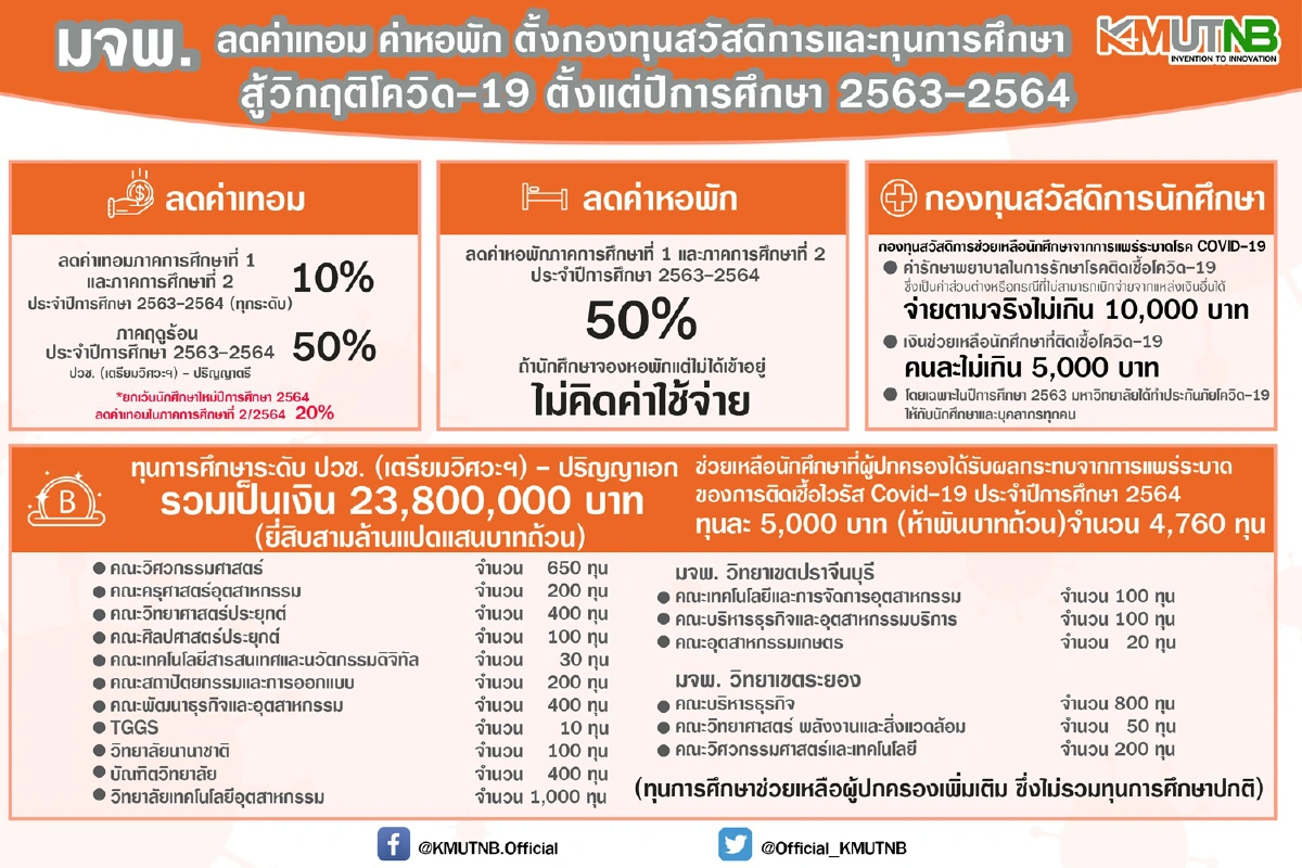 มหาวิทยาลัยเทคโนโลยีพระจอมเกล้าพระนครเหนือประกาศ ลดค่าเทอม ค่าหอพัก ตั้งกองทุนสวัสดิการและทุนการศึกษาสู้วิกฤติโควิด-19 เพื่อบรรเทาความเดือดร้อนของนักศึกษาผู้ปกครอง