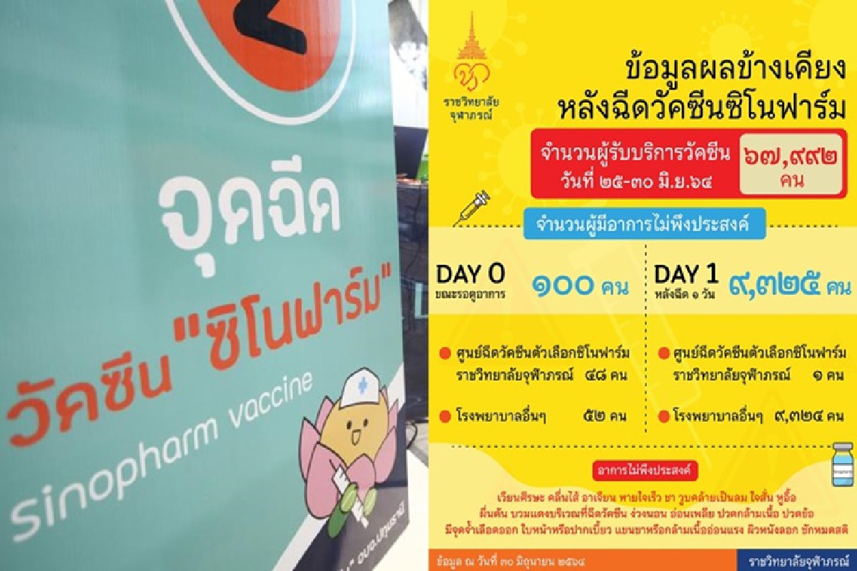 เพจเฟซบุ๊ก ราชวิทยาลัยจุฬาภรณ์ Chulabhorn Royal Academy รายงานข้อมูลผลข้างเคียงจากการฉีดวัคซีนตัวเลือก "ซิโนฟาร์ม" วันที่ 25 - 30 มิถุนายน 2564 มีผู้ได้รับวัคซีนซิโนฟาร์ม ทั้งหมด 67,992 คน ทั้งนี้ ผู้ได้รับวัคซีน โควิด-19 จากศูนย์ฉีดวัคซีนตัวเลือกซิโนฟาร์ม ราชวิทยาลัยจุฬาภรณ์ จำนวน 16,823 คน เกิดอาการไม่พึงประสงค์ระหว่างรอสังเกตอาการภายในเวลา 30 นาที (Day 0) 48 คน (0.29%) โดยผู้รับวัคซีนมีอาการ เวียนศีรษะ , คลื่นไส้ , อาเจียน , หายใจเร็ว , ชา วูบคล้ายเป็นลม , ใจสั่น , หูอื้อ และ อาการคัน ผู้ป่วยทั้งหมดหลังรับการรักษาที่จุดปฐมพยาบาล สามารถกลับบ้านได้ ยกเว้น 1 คน ที่มีอาการชัก แพทย์ส่งต่อห้องฉุกเฉิน ศูนย์การแพทย์มะเร็งวิทยาจุฬาภรณ์ หลังตรวจสแกนสมองไม่พบความผิดปกติในเนื้อสมอง แต่อาการที่เกิดเกี่ยวเนื่องจากโรคประจำตัวเดิม คือ โรคลมชัก และ โรคเบาหวาน