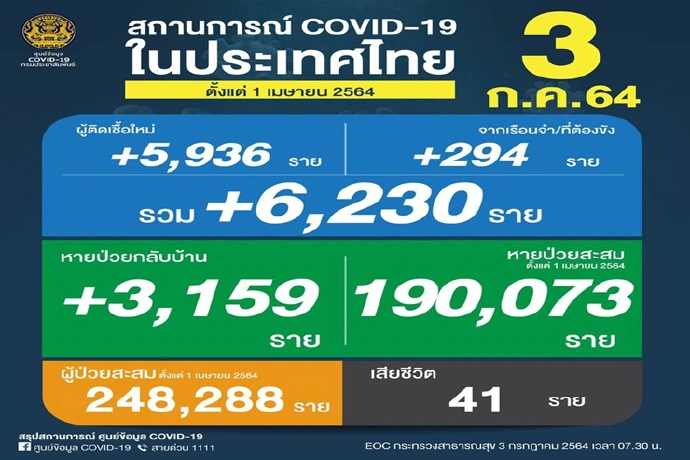 ศบค.เผยไทยติดเชื้อโควิดเพิ่ม 6,230 ราย มีผู้เสียชีวิตอีก 41 ราย ขณะที่ผู้ป่วยรักษาหายเพิ่ม 3,159 ราย