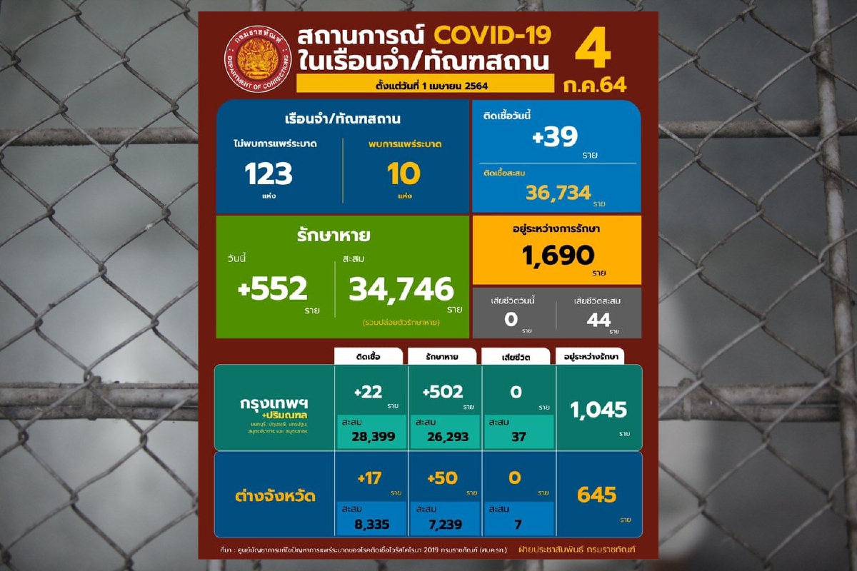 กรมราชทัณฑ์รายงานผู้ตัองขังติดโควิดเพิ่มขึ้น 39 คน หายป่วยเพิ่ม 552 คน อยู่ระหว่างการรักษา 1,690 ตนเผยยอดผู้ป่วยระหว่างรักษาต่ำกว่า 2,000 รายเป็นวันแรก