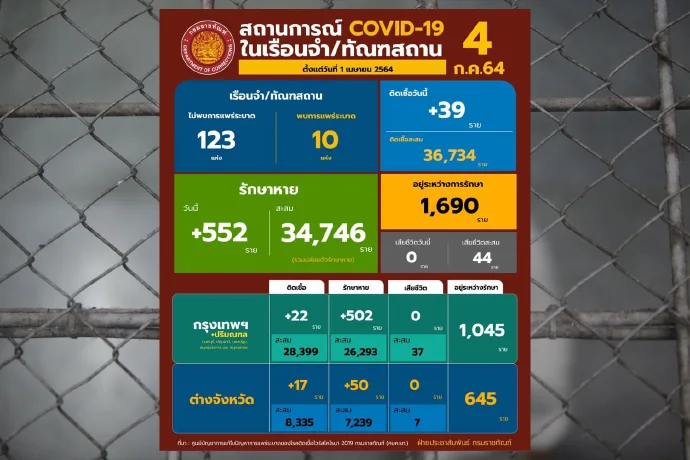 นายอายุตม์ สินธพพันธุ์ อธิบดีกรมราชทัณฑ์ กล่าวถึงสถานการณ์การแพร่ระบาดของโรคติดเชื้อไวรัสโควิด-19 ในเรือนจำและทัณฑสถานว่า จากข้อมูล ณ วันที่ 3 ก.ค. 64 เวลา 16.00 น. พบผู้ต้องขังติดเชื้อรายใหม่ 39 คน หายป่วย 552 คน ทำให้มีผู้ติดเชื้อที่ยังอยู่ในการรักษา 1,690 ราย