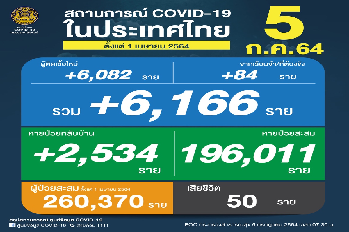 ศบค.รายงานสถานการณ์โควิดวันนี้ พบผู้ติดเชื้อเพิ่มขึ้น 6,166 ราย เสียชีวิตอีก 50 ราย หายป่วยเพิ่ม 2,534 ราย